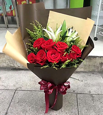7朵百合(粉色+白色),50只鮮花(戴安娜玫瑰+白玫瑰+香檳玫瑰+紅色康乃馨)